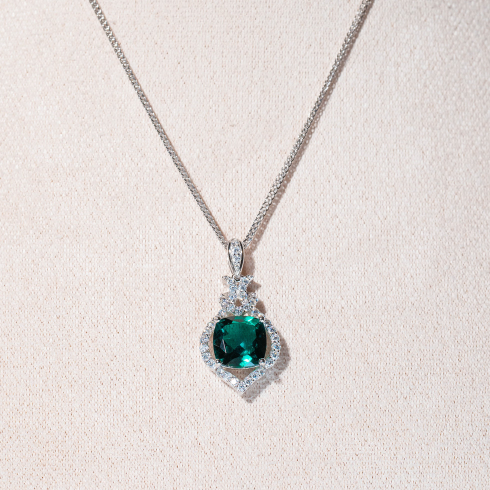 Encircled by a constellation of zircon stones, the lab-grown emerald radiates like a luminous spark of green against the night sky. Set in 925 sterling silver, the pendant embodies both purity and quiet grandeur, capturing light in a timeless embrace.